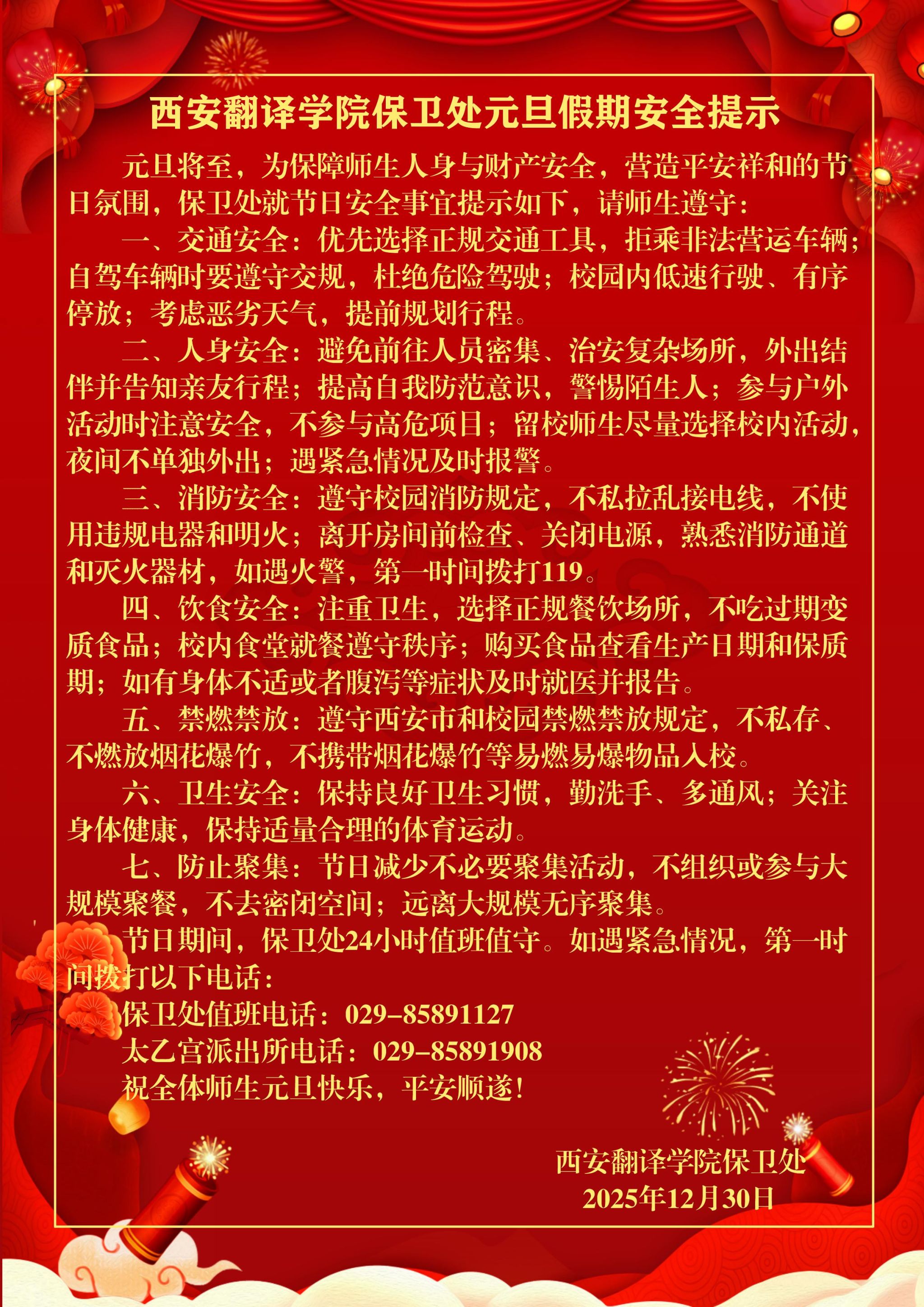 西安翻译学院保卫处元旦假期安全提示