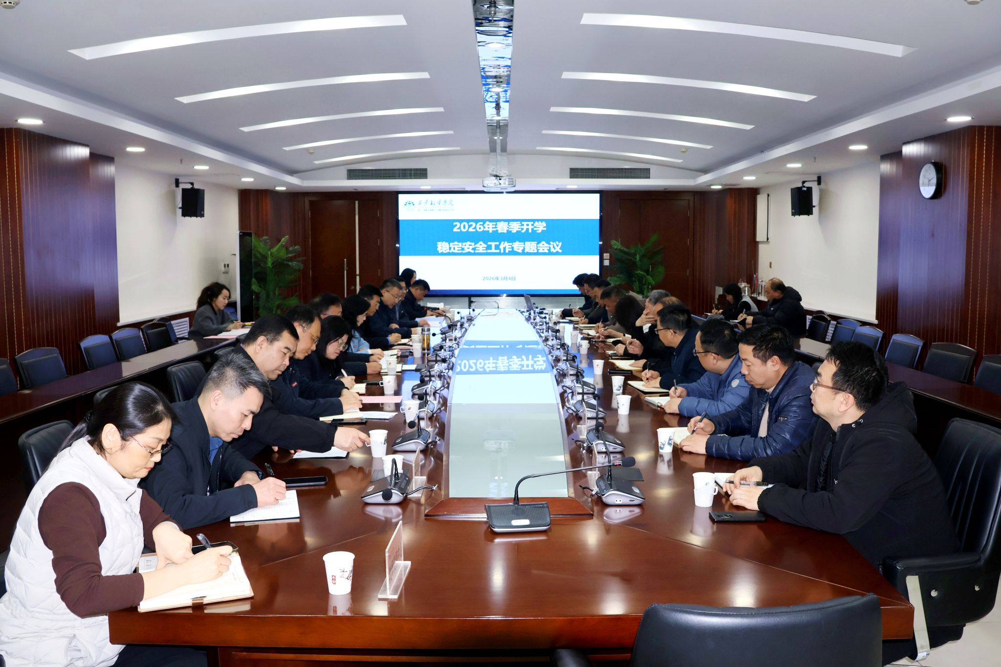 3月4日下午,我校召开2026年春季开学稳定安全工作专题会议。会议传达学习了高校稳定安全工作的有关文件精神,分析研判当前校园安全稳定形势,并就近期稳定安全工作进行系统部署。党委书记、政府督导专员马洁出席会议并讲话,副校长武忠远、郭炜,党委副书记、副校长张恒结合分管领域介绍稳定安全相关工作情况。相关职能部门负责人、各学部(院)党委书记参加会议。会议由张恒主持。